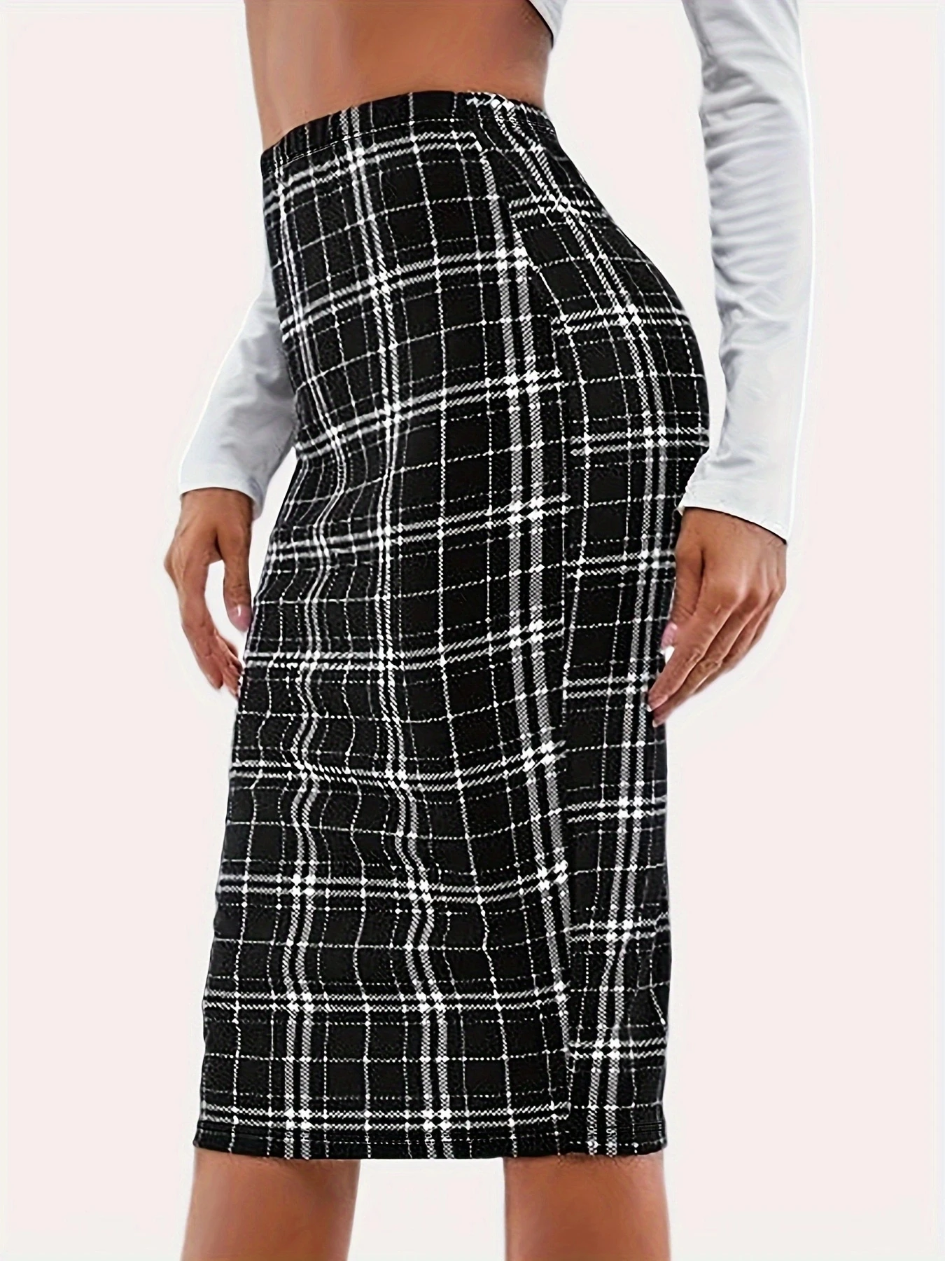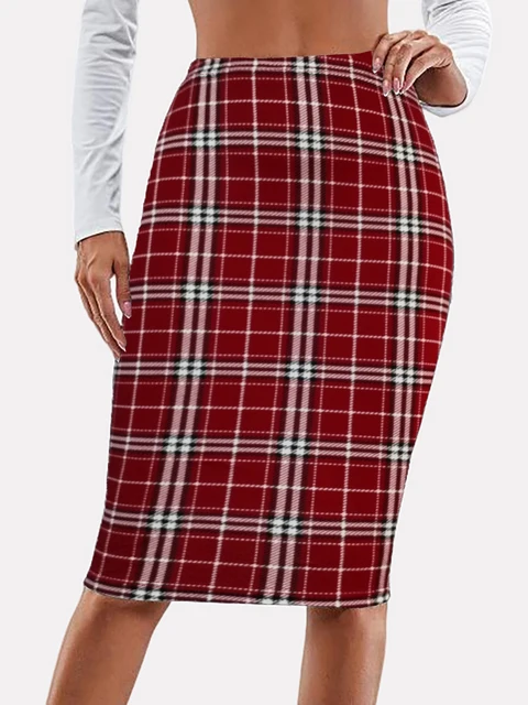 Fashion Plaid Printed Knee Length Skirts High Waist Back Zip Up Pencil Skirts Elegant Midi Skirts