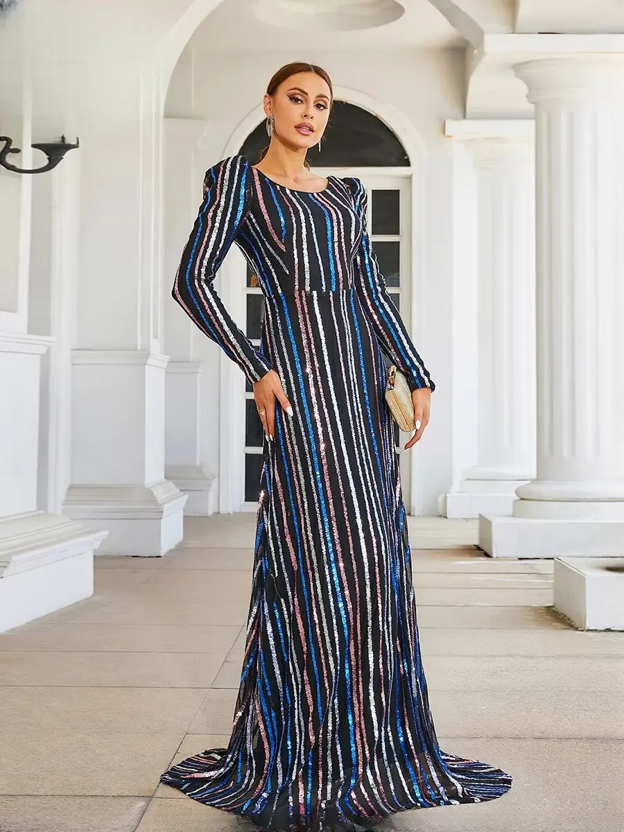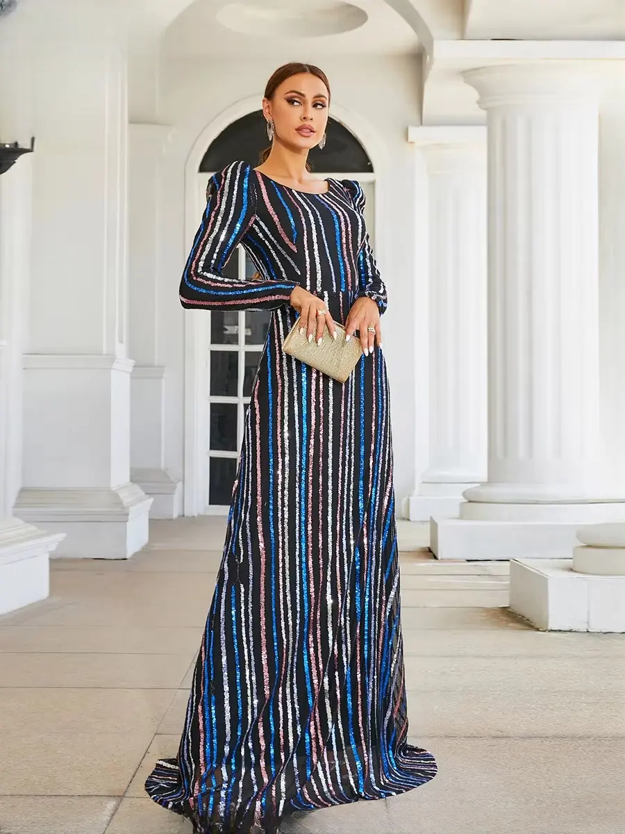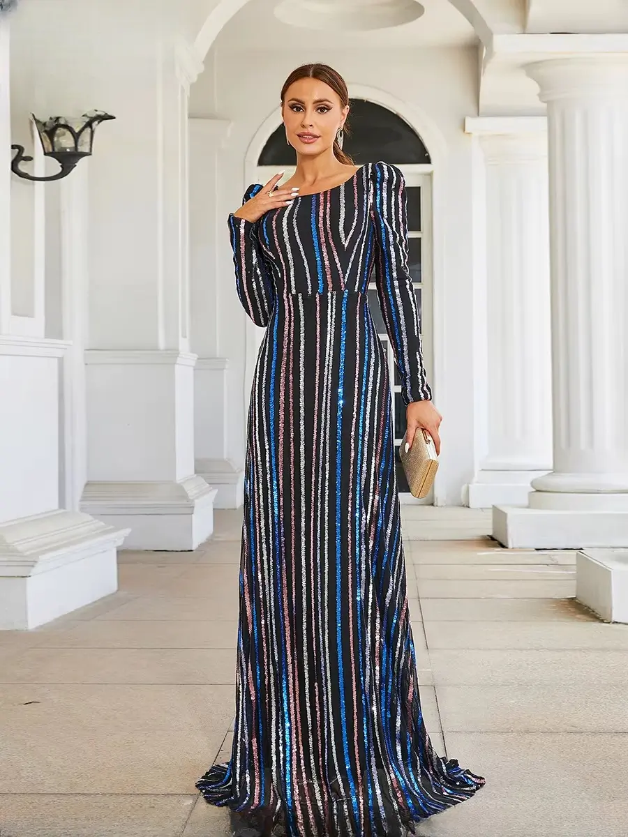 Luxury Long Sleeved High Quality Striped Formal Evening Floor Length Dresses