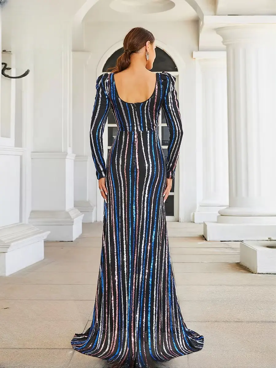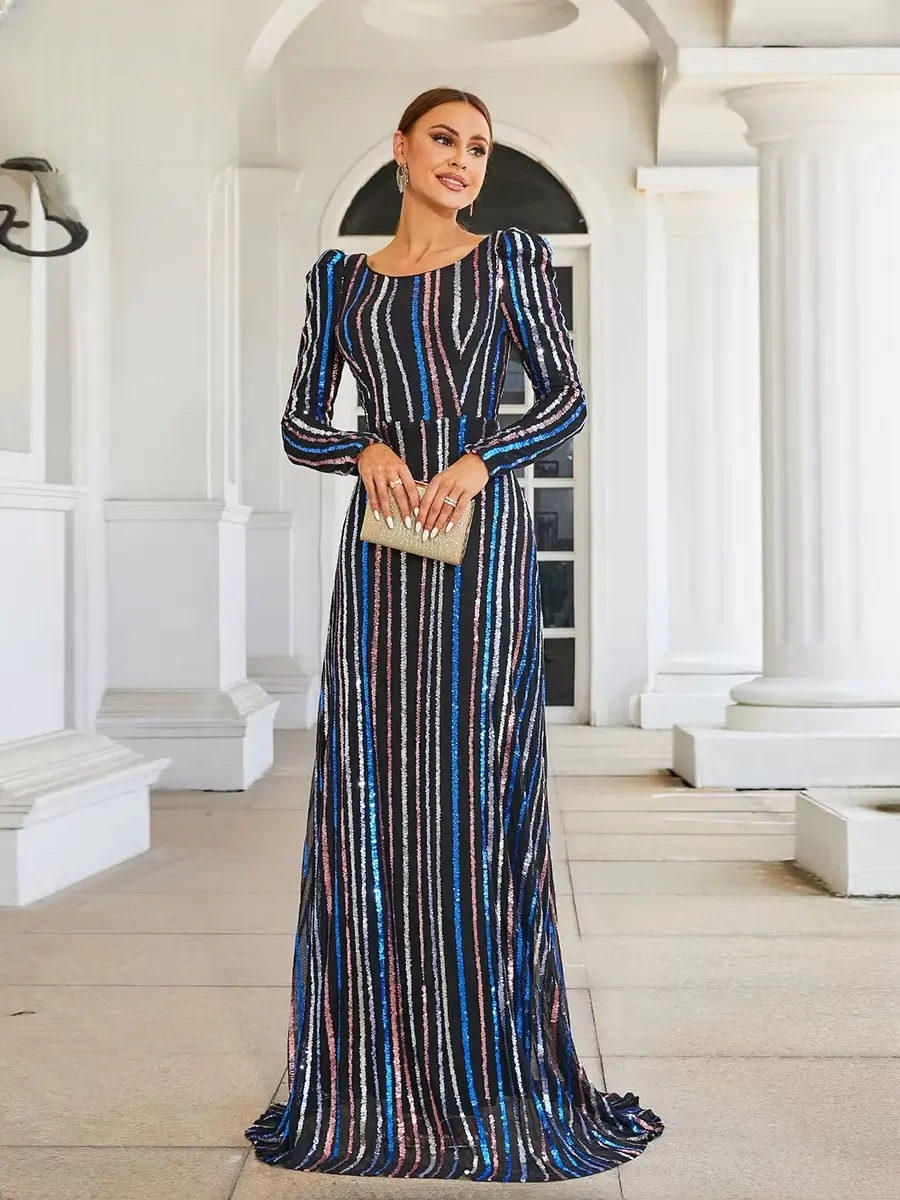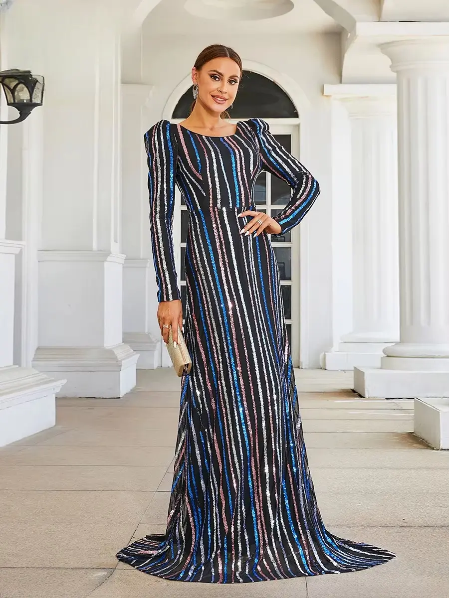 Luxury Long Sleeved High Quality Striped Formal Evening Floor Length Dresses